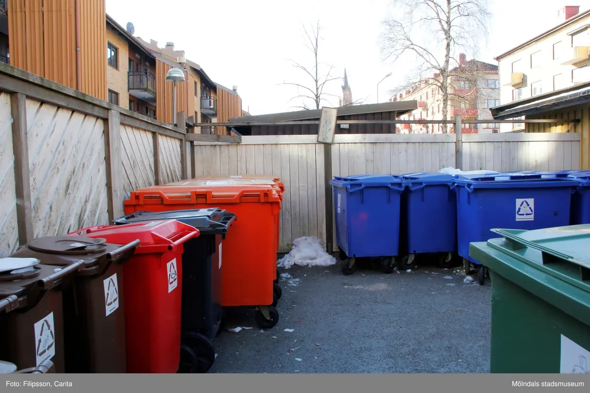 Källsorteringskärl vid miljöstation belägen på gårdssidan av hus på Bergmansgatan i Mölndals Centrum. Fotografi taget den 26 februari 2018. Byggnadsdokumentation inför rivning.