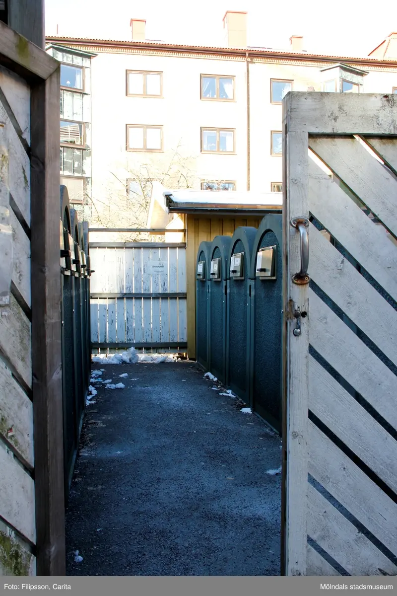 Källsorteringskärl vid miljöstation belägen på gårdssidan av hus på Bergmansgatan i Mölndals Centrum. Fotografi taget den 26 februari 2018. Byggnadsdokumentation inför rivning.