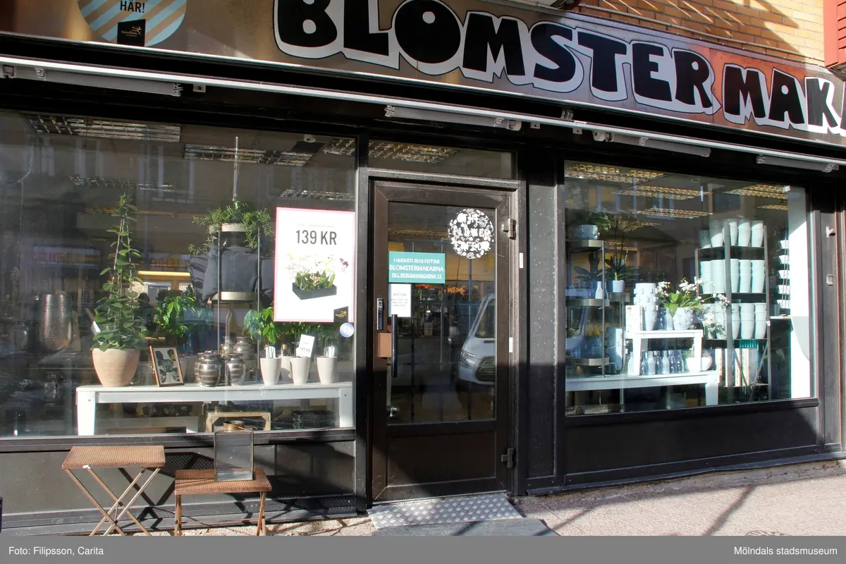 Huset med adress Bergmansgatan 4 i Mölndals Centrum. Entré och skyltfönster till Blomstermakarna i gatuplanet. Fotografi taget den 27 februari 2018. Byggnadsdokumentation inför rivning.