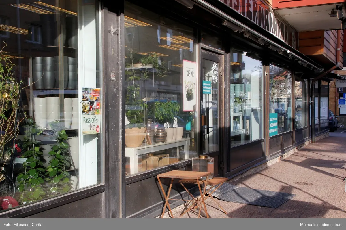 Huset med adress Bergmansgatan 4 i Mölndals Centrum. Entré och skyltfönster till Blomstermakarna i gatuplanet. Husets sydöstra sida. Fotografi taget den 27 februari 2018. Byggnadsdokumentation inför rivning.