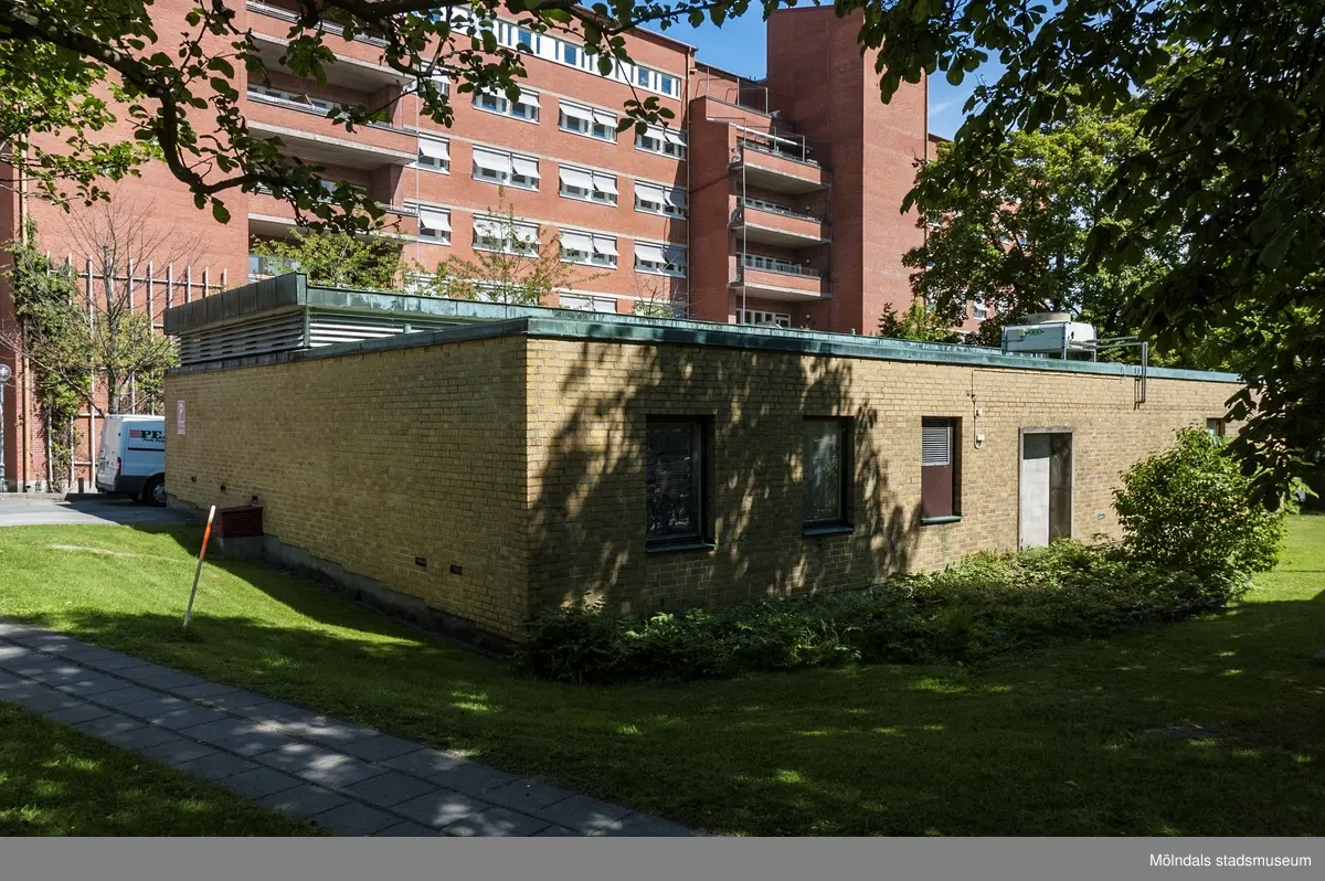 Byggnad X tillhörande Mölndals sjukhus i Bosgården, Mölndal. Gavel mot väster, fasad mot söder. Fotografi taget den 10 juni 2014. Byggnadsdokumentation inför rivning.