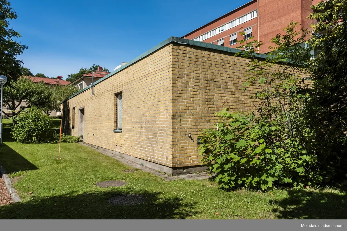 Byggnad X tillhörande Mölndals sjukhus i Bosgården, Mölndal. Fasad mot söder, gavel mot öster. Fotografi taget den 10 juni 2014. Byggnadsdokumentation inför rivning.