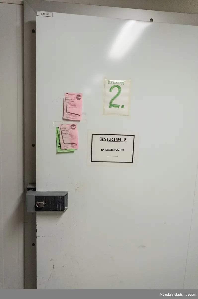 Kylrumsdörr i byggnad X tillhörande Mölndals sjukhus i Bosgården, Mölndal. Fotografi taget den 10 juni 2014. Byggnadsdokumentation inför rivning.