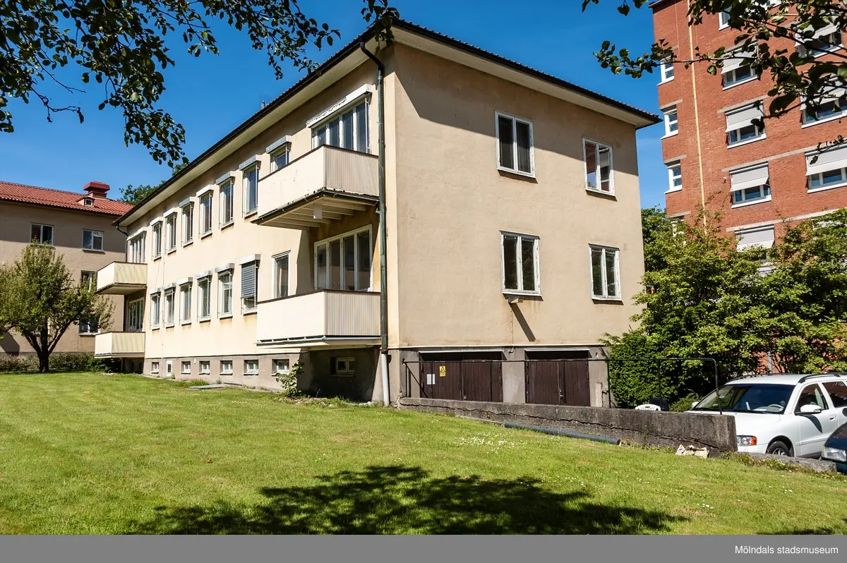 Byggnad U2 tillhörande Mölndals sjukhus i Bosgården, Mölndal. Fasad mot söder, gavel mot öster. Fotografi taget den 10 juni 2014. Byggnadsdokumentation inför rivning.