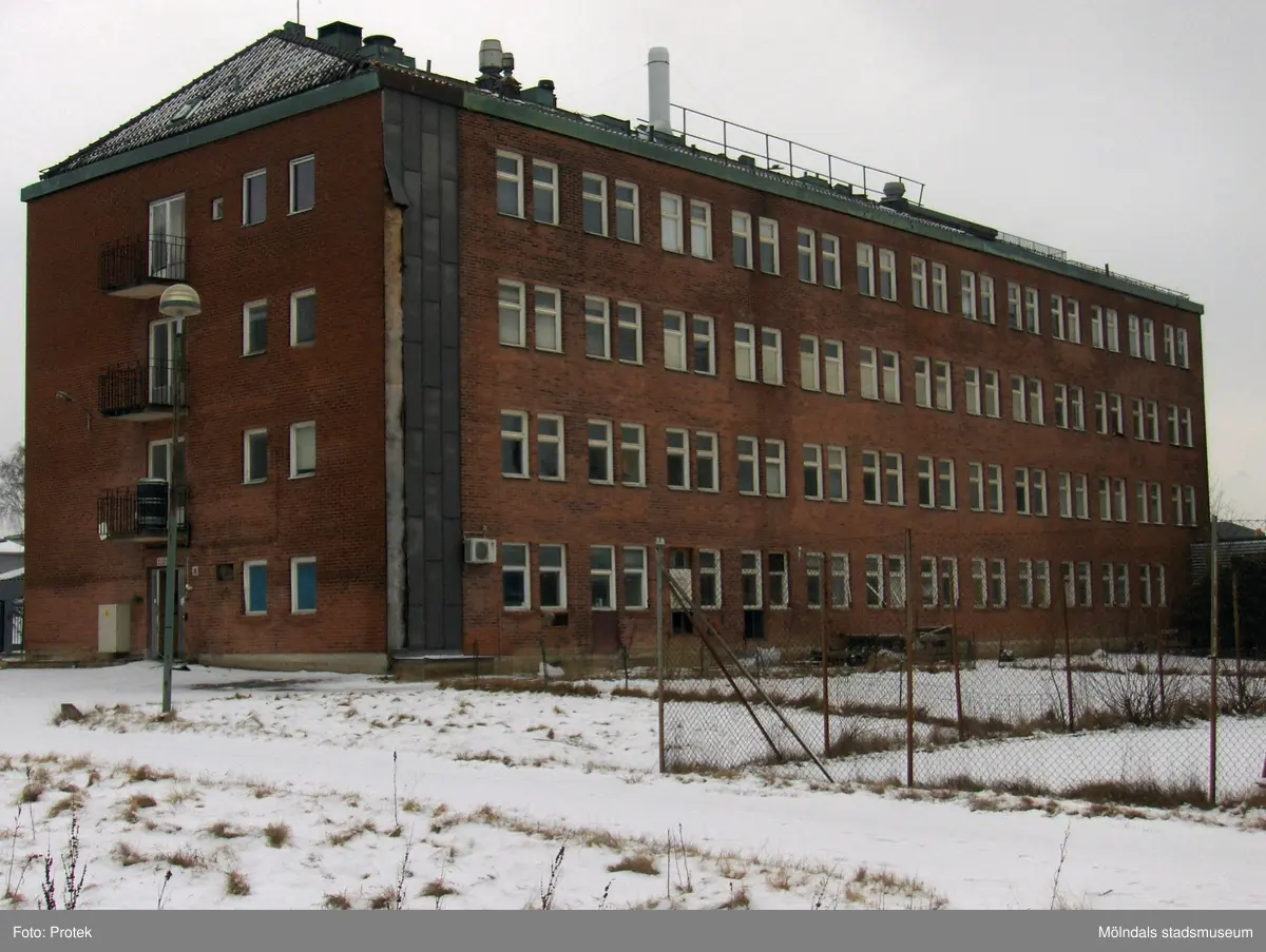 Kontorsbyggnad i rött tegel med fastighetsbeteckning Pottegården 2 och gatuadress Kråketorpsgatan 18 i Åbro industriområde i Mölndal. Fotografi taget den 17 februari 2011. Diarienummer: BN 1083/2019.