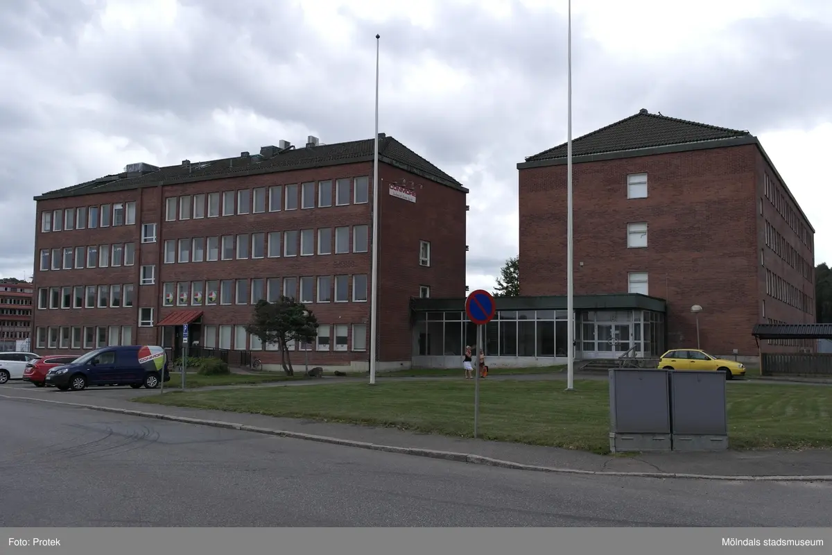 Kontorsbyggnader i rött tegel med fastighetsbeteckning Pottegården 2 och gatuadress Kråketorpsgatan 18 i Åbro industriområde i Mölndal. Fotografi taget den 31 juli 2014. Byggnadsdokumentation inför rivning. Diarienummer: BN 1083/2019.