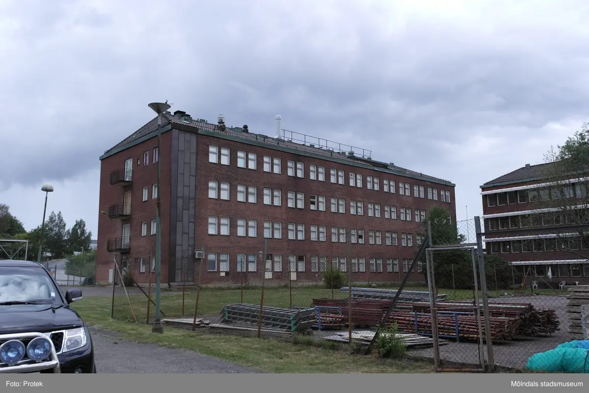Kontorsbyggnader i rött tegel med fastighetsbeteckning Pottegården 2 och gatuadress Kråketorpsgatan 18 i Åbro industriområde i Mölndal. Fotografi taget den 31 juli 2014. Byggnadsdokumentation inför rivning. Diarienummer: BN 1083/2019.