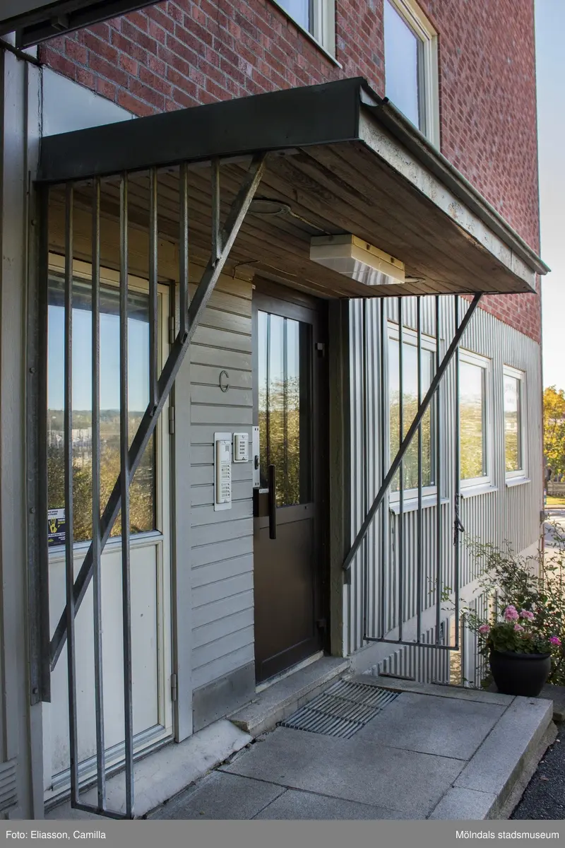 Entré till bostadshuset Streteredsvägen 1 i Kållereds centrum den 6 oktober 2016. Fasad mot väster vid ingång C.