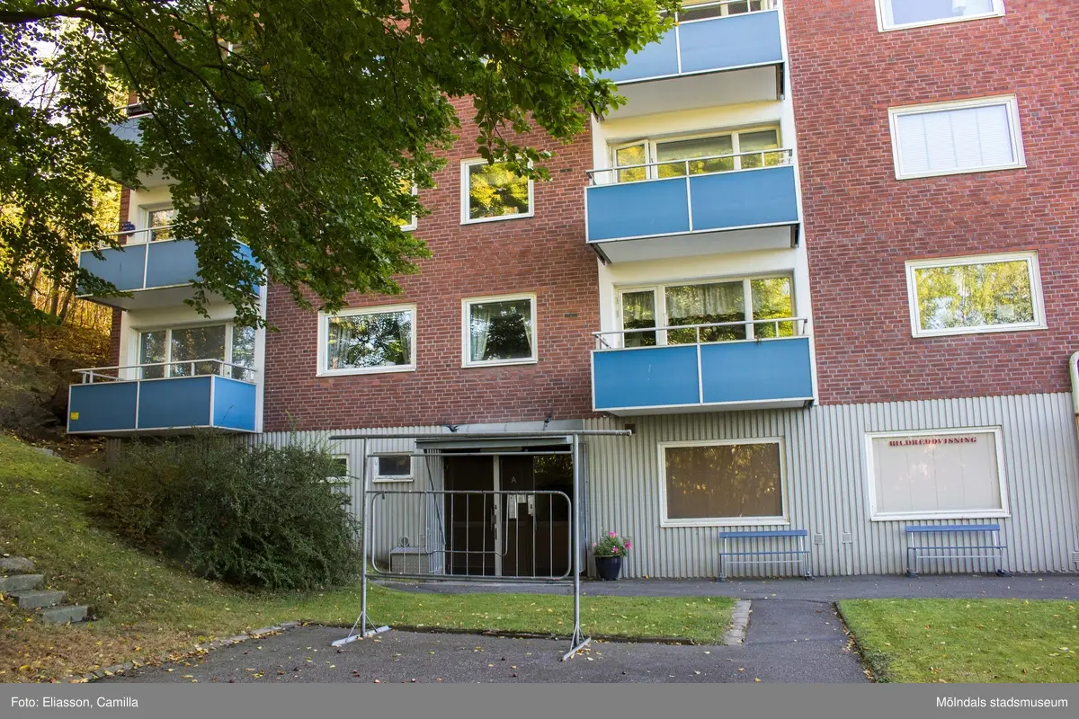 Bostadshuset Streteredsvägen 1 i Kållereds centrum den 6 oktober 2016. Fasad mot väster. På bilden ses en mattställning på gården vid ingång A.