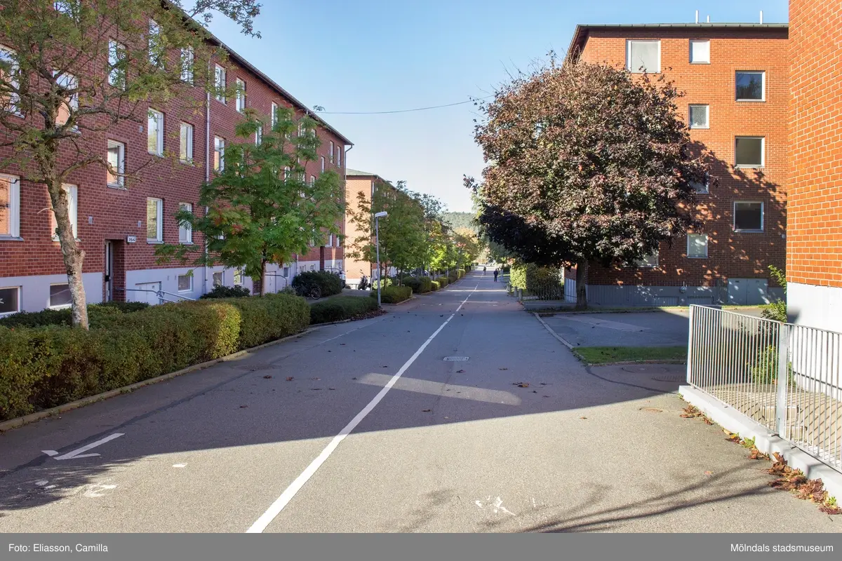 Gång- och cykelbana genom bostadsbebyggelsen vid Våmmedalsvägen i Våmmedal, Kållered, den 6 oktober 2016. Vy västerut.