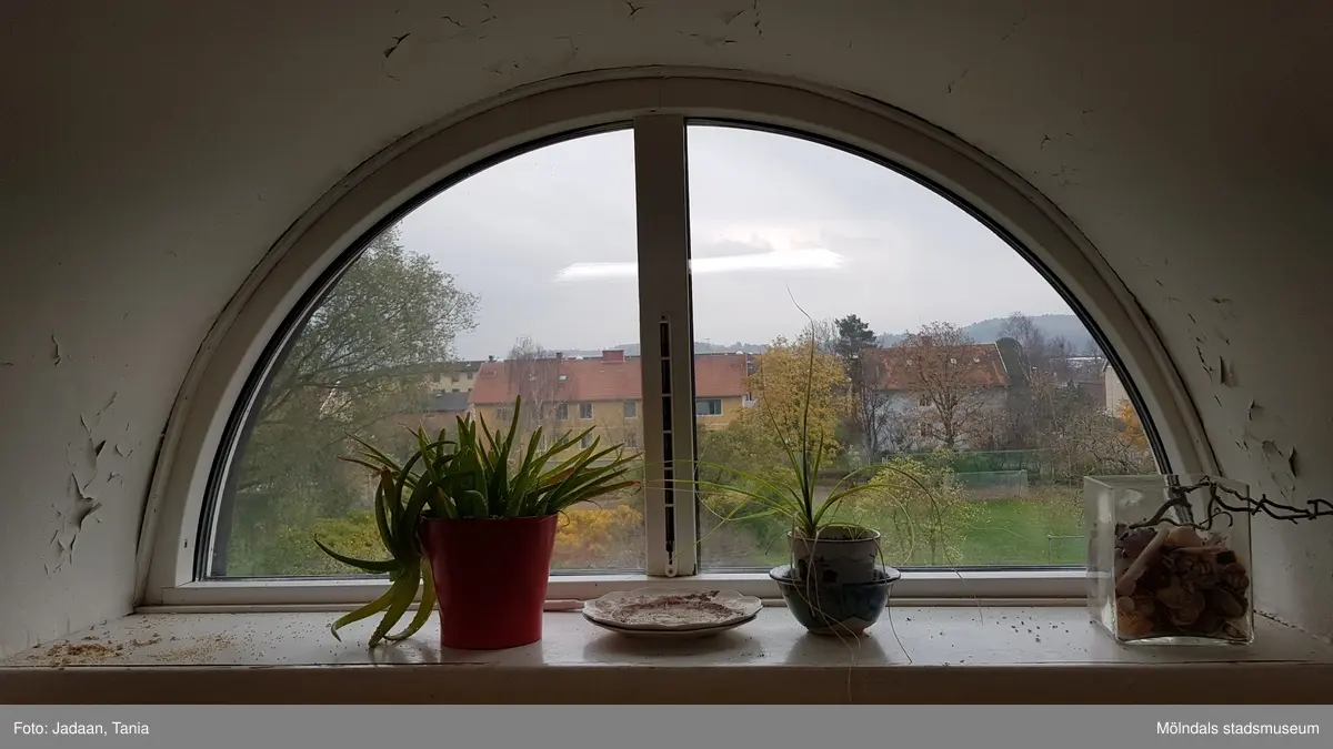 Vy söderut genom homejfönster på vinden i fastigheten Mörten 1, Åbybergsgatan 28, i Broslätt i Mölndal. Fotografi taget den 2 november 2018. Byggnadsdokumentation inför rivning.
