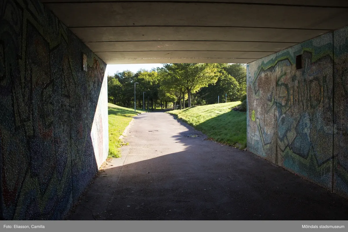 Gångtunneln som går under Valåsvägen i Lindome centrum den 4 oktober 2016. Väggarna i tunneln är dekorerade med färgglada målningar. Tunneln ligger precis nedanför Församlingscentrum vid Annestorpsvägen. Vy mot öster.