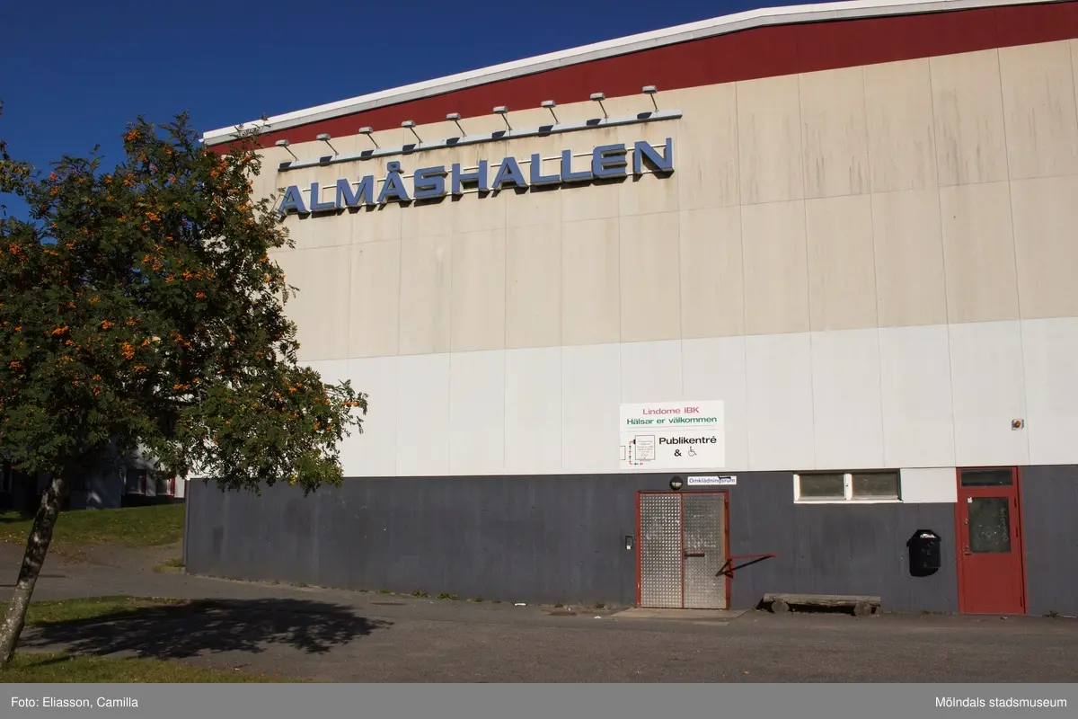 Idrottsanläggningen Almåshallen vid Almåsgången i Lindome den 4 oktober 2016. Fasaden vetter mot söder.