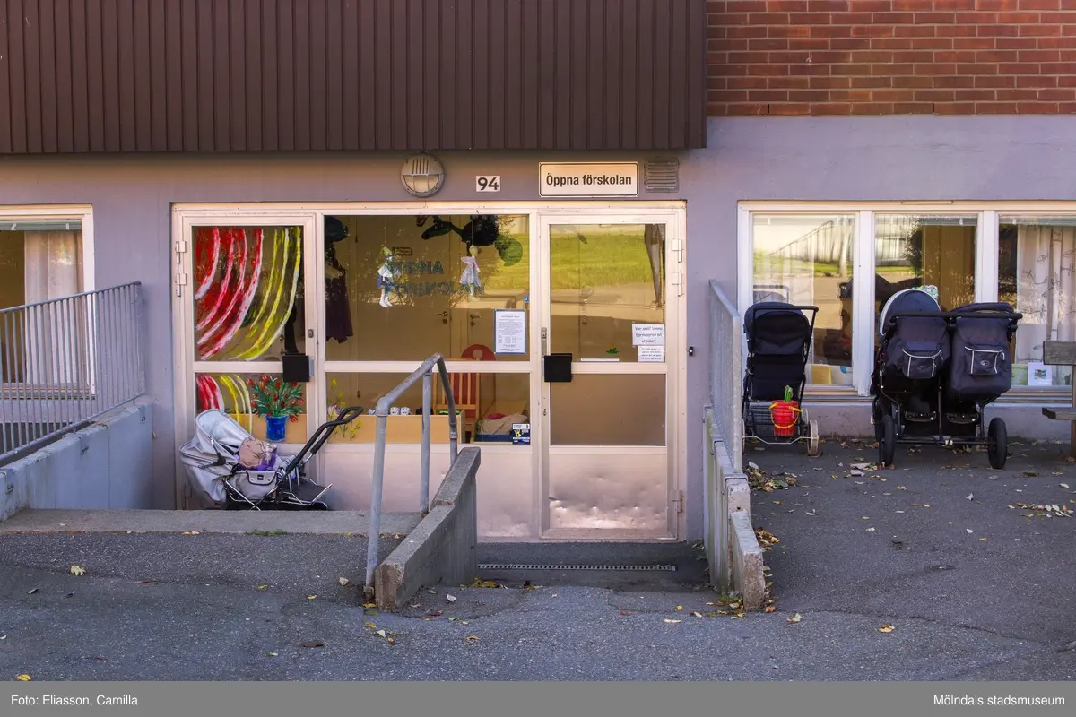 Entré till öppna förskolan med adress Våmmedalsvägen 94 i Våmmedal, Kållered, den 6 oktober 2016. På utsidan står ett par barnvagnar.