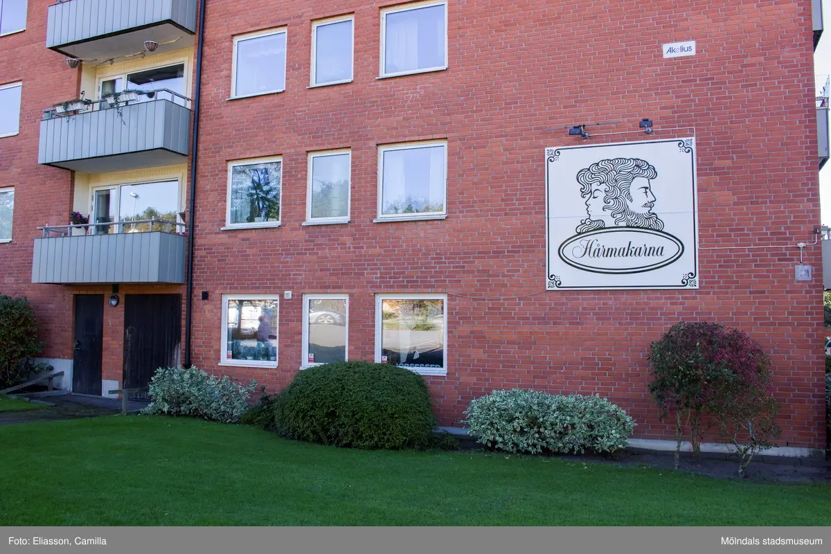 En stor skylt för Hårmakarna är uppsatt på fasaden till bostadshuset Våmmedalsvägen 10 i Våmmedal, Kållered, den 6 oktober 2016. Fasaden vetter mott norr,