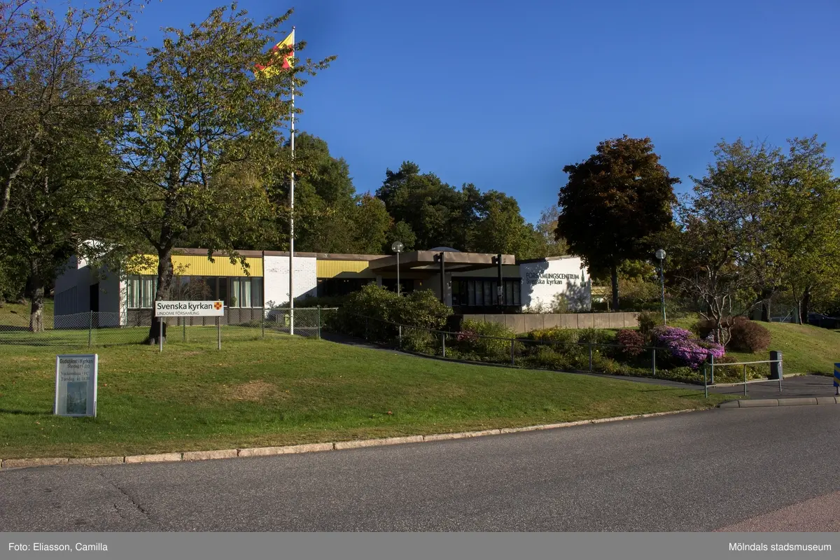 Församlingscentrum Lindome med adress Annestorpsvägen 1 i Annestorp, Lindome, den 4 oktober 2016. Fasad mot söder.