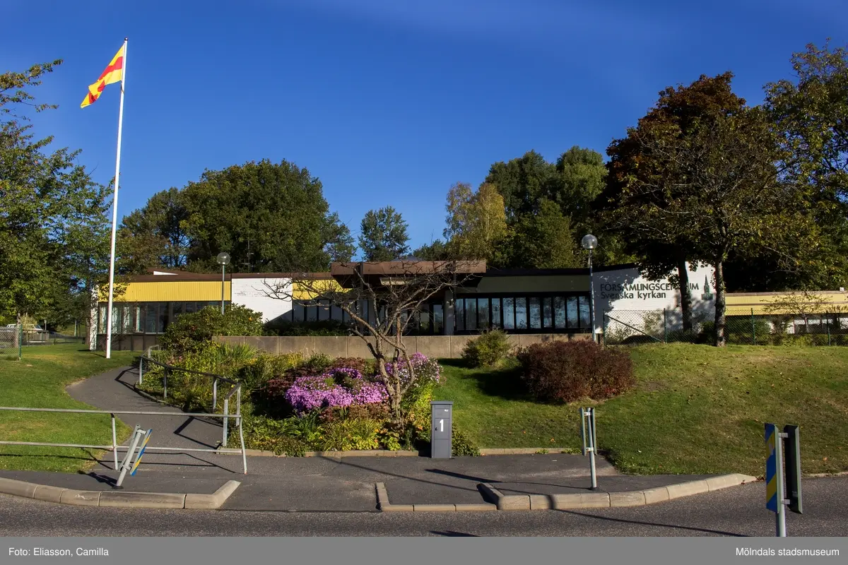 Församlingscentrum Lindome med adress Annestorpsvägen 1 i Annestorp, Lindome, den 4 oktober 2016. Fasad mot söder.