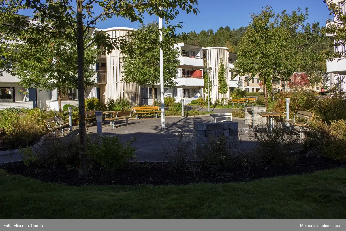 Innergård till bostadsområdet Dotegården i Lindome den 4 oktober 2016. Gården är utrustad med en grillplats. Närmast ses huset Dotegården 15-18. Vy mot nordväst.