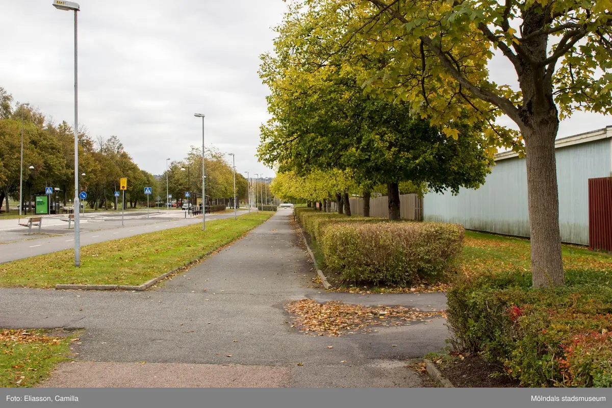Idrottsvägen vid Åby Fritidscentrum i Åby, Mölndal, den 11 oktober 2016. Vy österut från gångvägen till höger om cykelbanan och bilvägen.