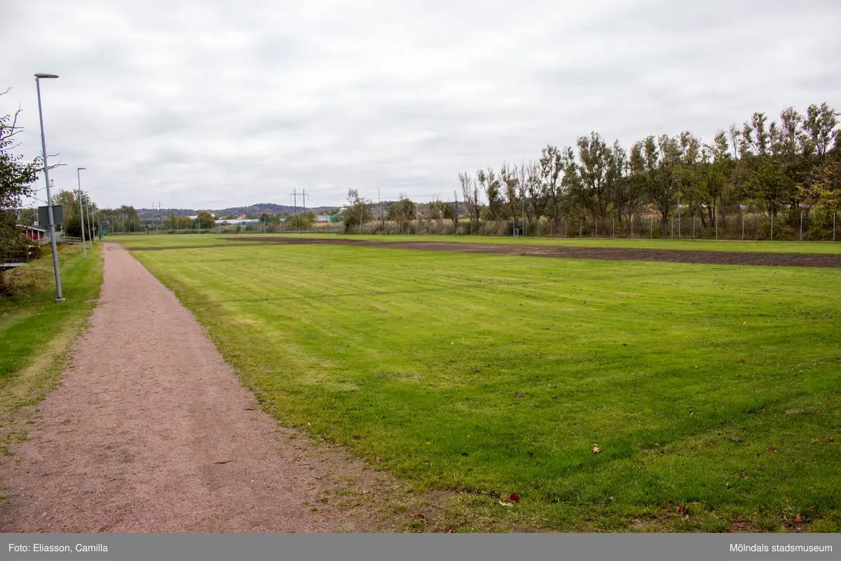 Elljusförsett motionsspår i Åby Fritidscentrum i Åby, Mölndal, den 11 oktober 2016. Till höger ses även fotbollsplaner närmast ån som gränsar till Söderleden.