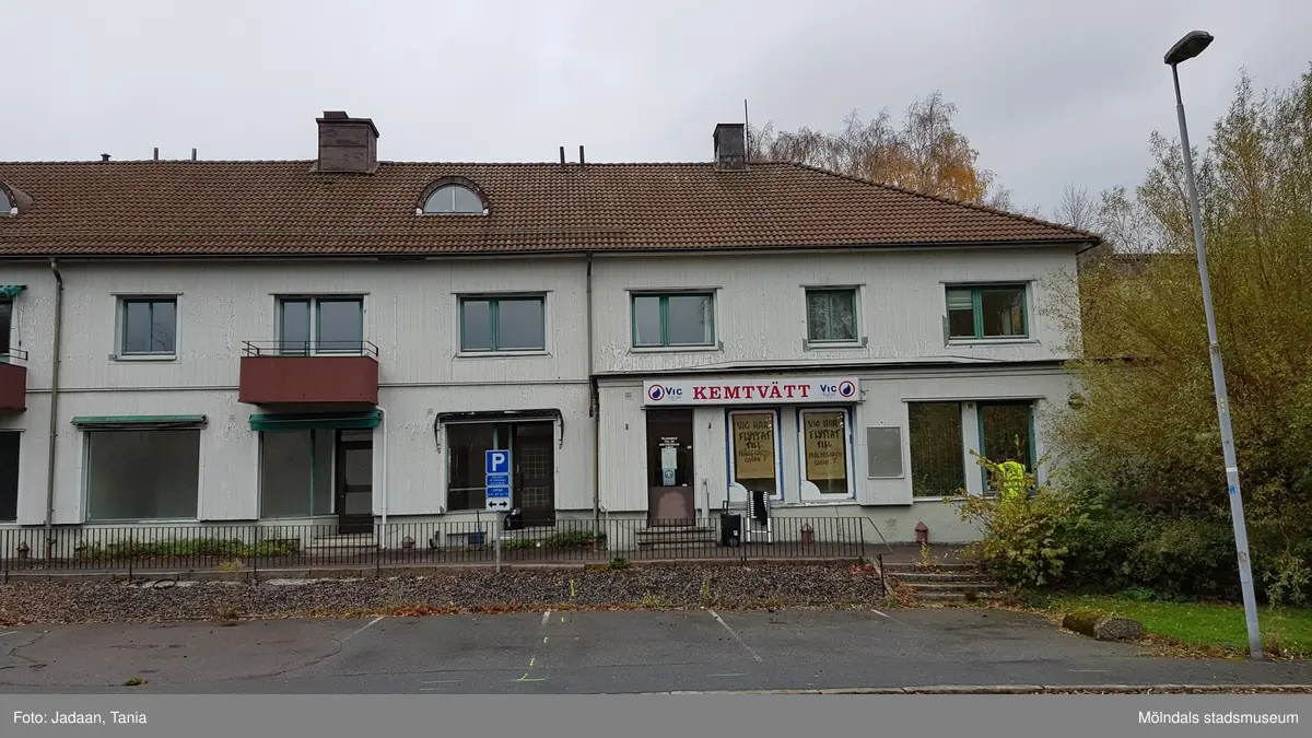 Fastigheten Mörten 1, Åbybergsgatan 28, i Broslätt i Mölndal. Fasad mot söder. Affärsskylt till Vic Kemtvätt sitter på fasaden. Fotografi taget den 2 november 2018. Byggnadsdokumentation inför rivning.