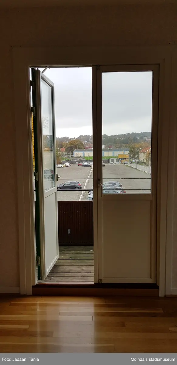 Öppen dörr mot balkongen. Vy från lägenhet i fastigheten Mörten 1, Åbybergsgatan 28, i Broslätt i Mölndal. Gavel mot öster. Fotografi taget den 10 oktober 2018. Byggnadsdokumentation inför rivning.