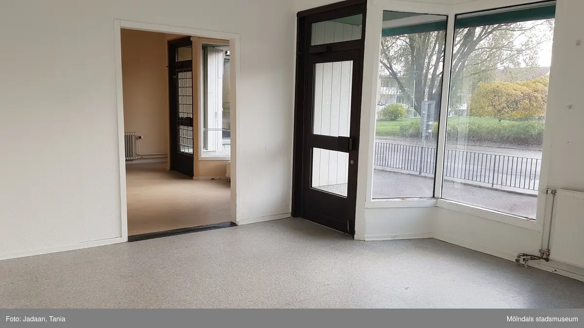 Vy söderut genom fönster från affärslokal i fastigheten Mörten 1, Åbybergsgatan 28, i Broslätt i Mölndal. Fotografi taget den 6 november 2018. Byggnadsdokumentation inför rivning.