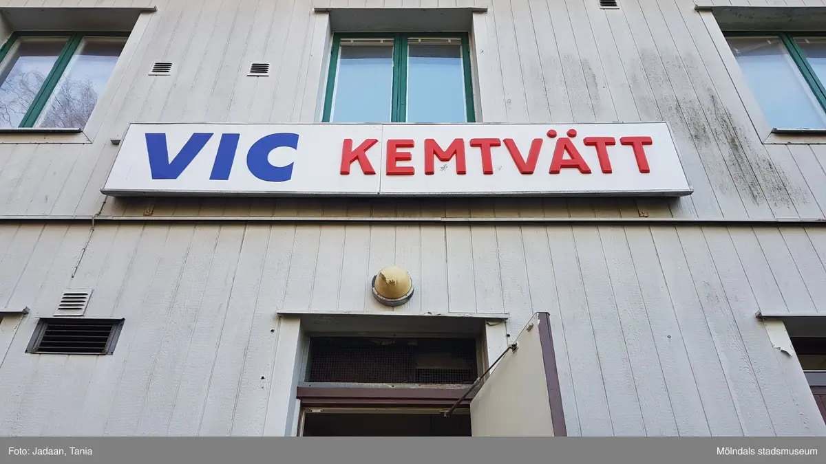 Affärsskylt till Vic Kemtvätt sitter på fasaden till fastigheten Mörten 1, Åbybergsgatan 28 i Broslätt i Mölndal. Fotografi taget den 6 november 2018. Byggnadsdokumentation inför rivning.