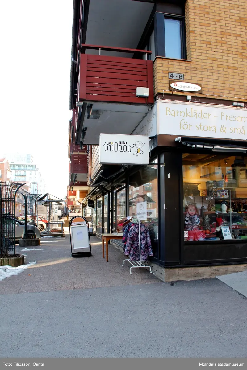 Hörnet på huset med adressen Bergmansgatan 4 i Mölndals Centrum. Entré och skyltfönster till affären Lilla Filur i gatuplanet. Fotografi taget den 26 februari 2018. Byggnadsdokumentation inför rivning.