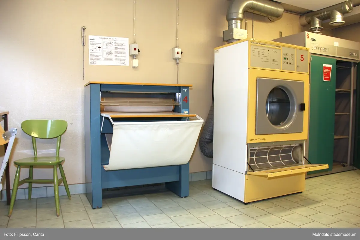 Torktumlare och mangel i källaren till något av husen med adresserna Bergmansgatan 4, 6, 8 och 10 i Mölndals Centrum. Fotografi taget den 27 februari 2018. Byggnadsdokumentation inför rivning.