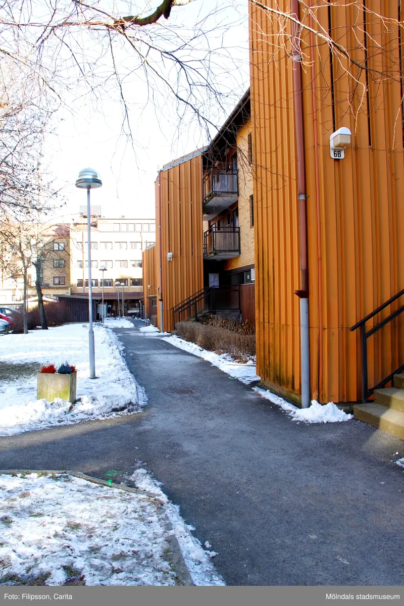 Gångbana utanför loftgångstrapphusen till bostadshuset Bergmansgatan 6A och 6B i Mölndals Centrum. Del av husets fasad som vetter mot gårdssidan. Fotografi taget den 26 februari 2018. Byggnadsdokumentation inför rivning.