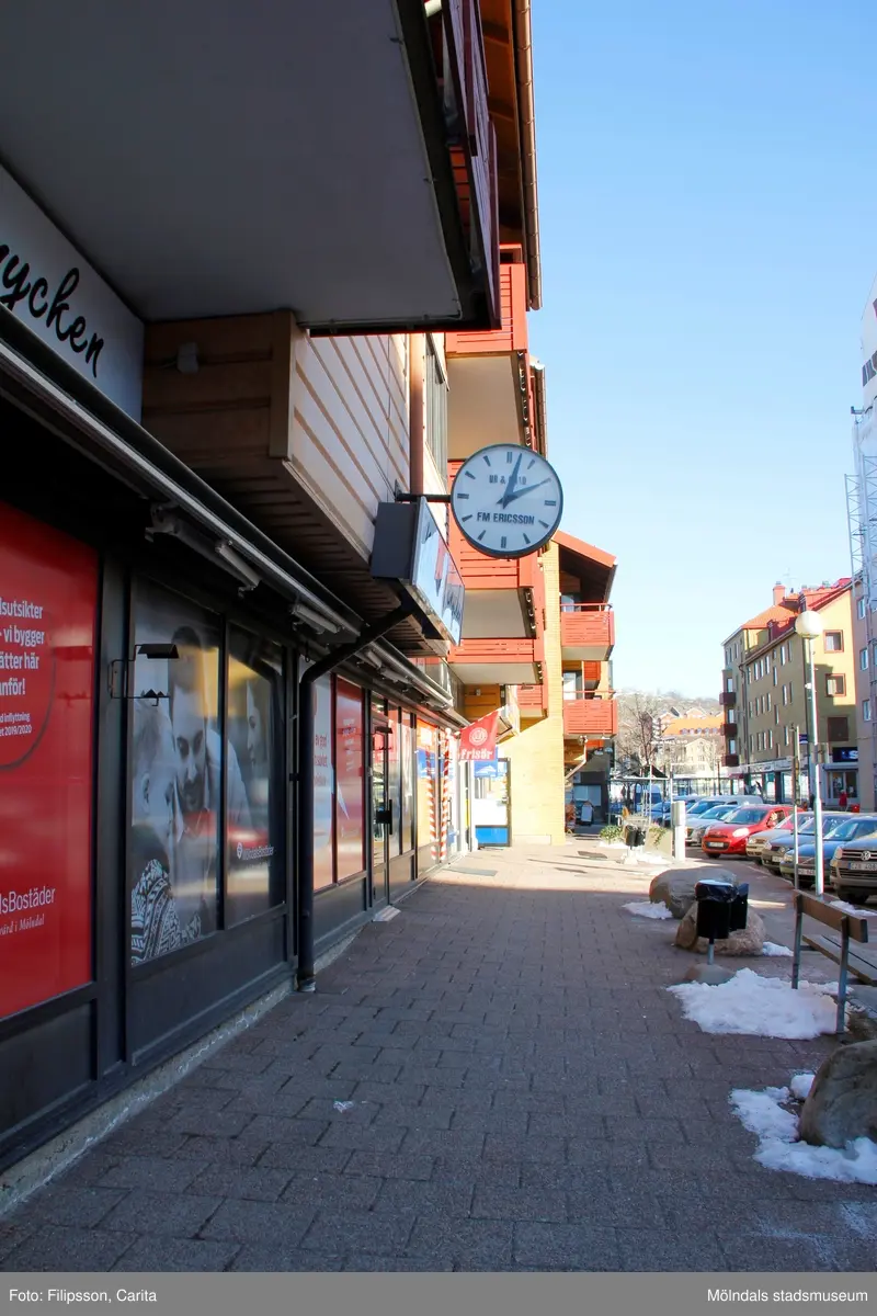 Trottoar utanför F.M. Ericsson Ur & Guldsmide med adress Bergmansgatan 6 i Mölndals Centrum. Vy mot nordost. Fotografi taget den 26 februari 2018. Byggnadsdokumentation inför rivning.