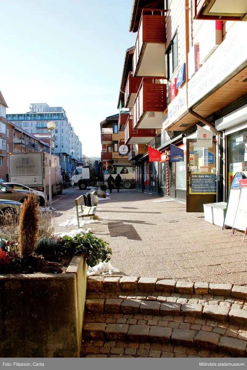 Trottoar utanför Direkten Mölndal Cigarr & Tobak med adress Bergmansgatan 6 i Mölndals Centrum. Vy mot sydväst. Fotografi taget den 26 februari 2018. Byggnadsdokumentation inför rivning.