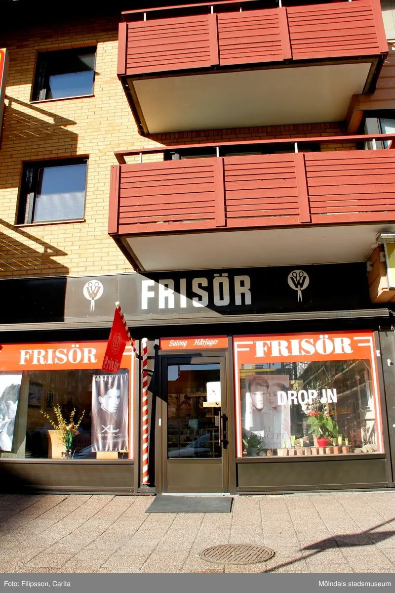 Fasaden till huset med adress Bergmansgatan 6 i Mölndals Centrum. Balkonger över entrén till Salong Hårfager i gatuplanet. Fotografi taget den 26 februari 2018. Byggnadsdokumentation inför rivning.