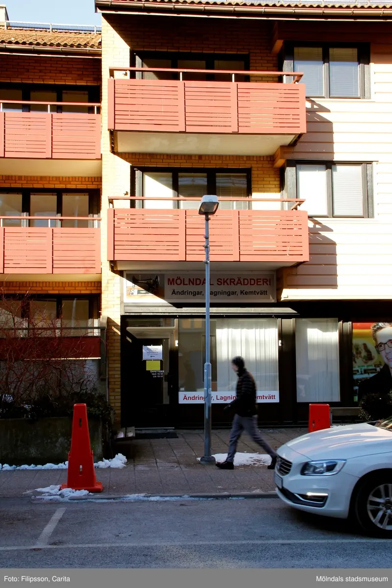 Huset med adress Bergmansgatan 8 i Mölndals Centrum. Entré och skyltfönster till Mölndal Skrädderi i gatuplanet. Fotografi taget den 26 februari 2018. Byggnadsdokumentation inför rivning.