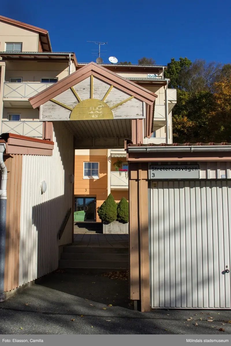 Entré mellan två garage till bostadshuset Streteredsvägen 3 som skymtas i bakgrunden. Våmmedal i Kållered den 6 oktober 2016. Fasad mot söder.