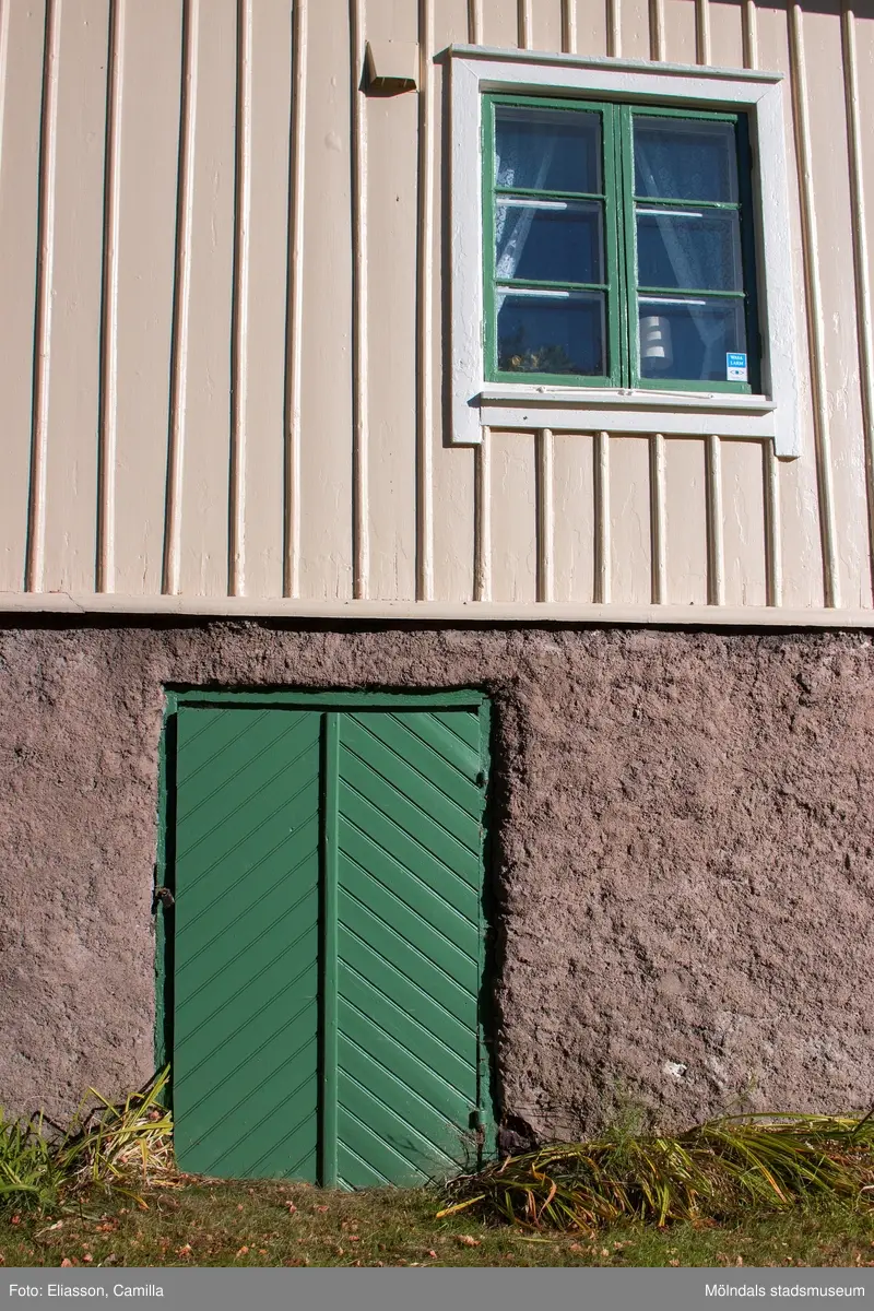 Våmmedal i Kållered den 6 oktober 2016. Detalj av södra fasaden till bostadshuset Streteredsvägen 7. En grön källardörr samt ett fönster.