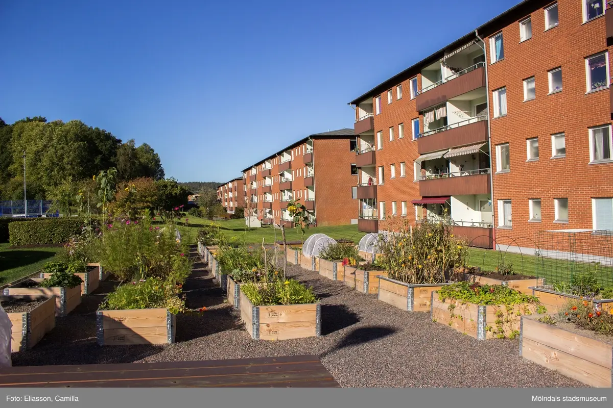 Odlingslotter i Våmmedal, Kållered, den 6 oktober 2016. Till höger ses bostadsbebyggelse vid Våmmedalsvägen. Fasader mot söder, vy mot väster.