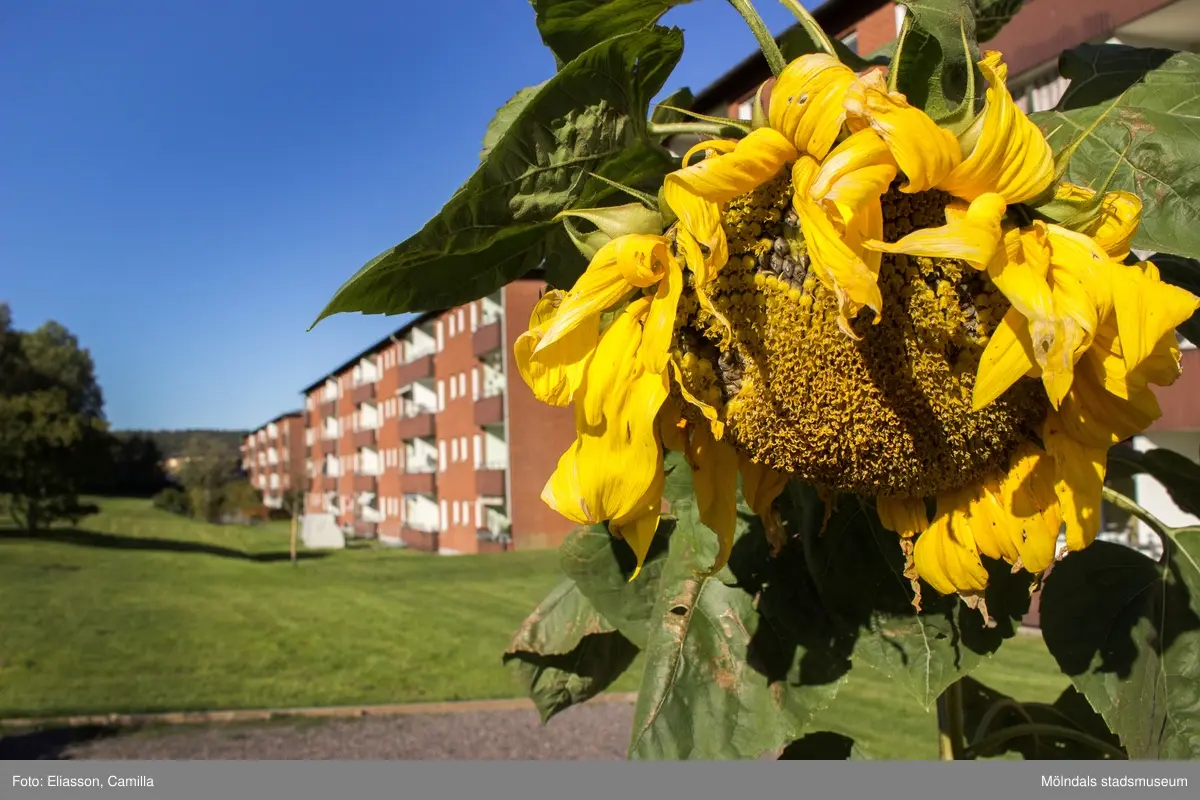 Det blommar i Våmmedal. Detalj av en solros. Odlingslotter i Våmmedal, Kållered, den 6 oktober 2016. I bakgrunden ses bostadsbebyggelse vid Våmmedalsvägen. Fasader mot söder, vy mot väster.