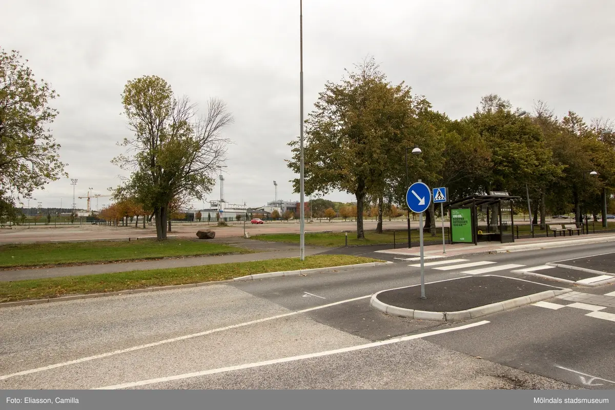 Övergångsställe vid busshållsplatsen Åby fritidscentrum vid Idrottsvägen i Åby, Mölndal, den 11 oktober 2016. Vy norrut, över en parkeringsplats, mot Åbytravet.