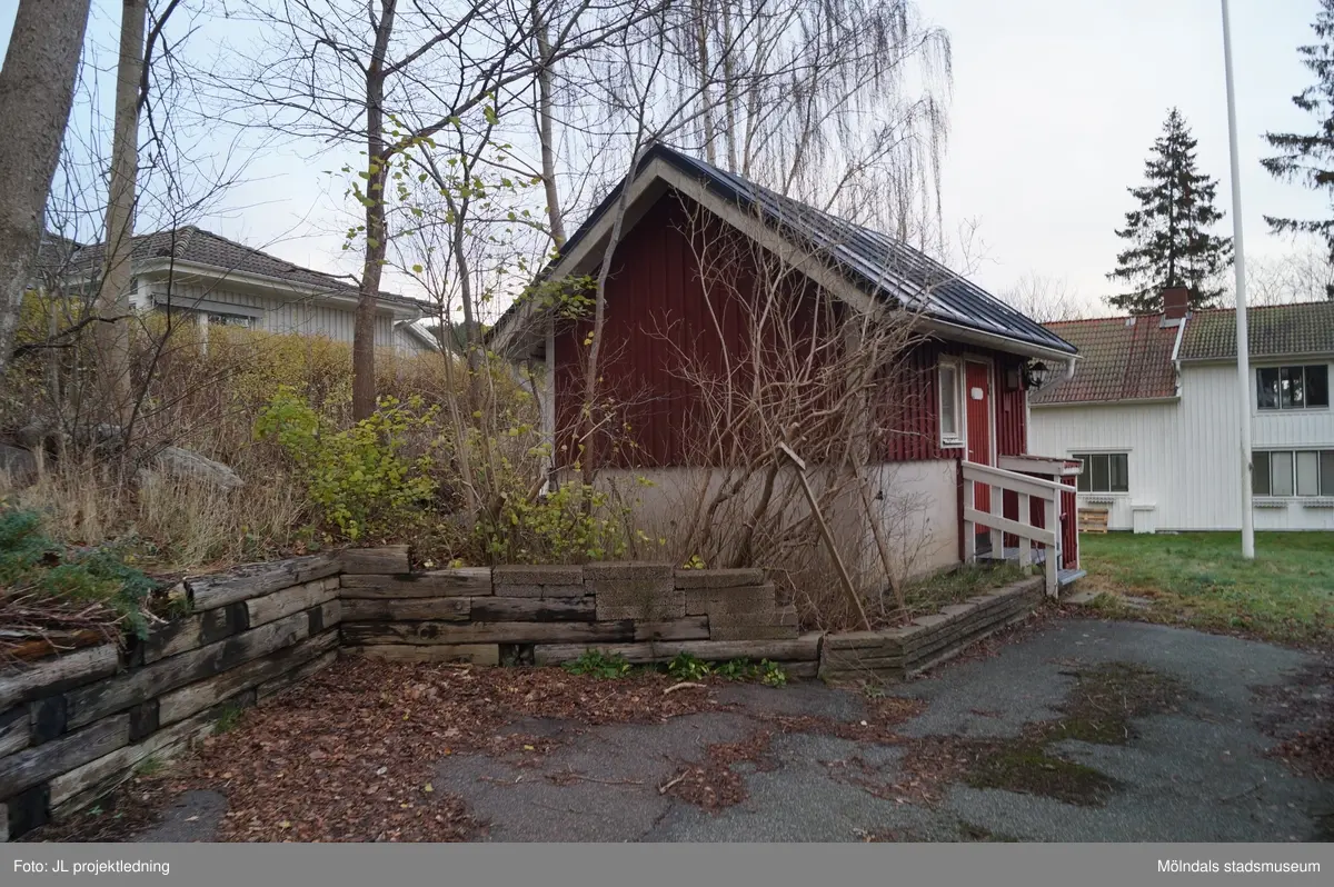 Rödmålat bostadshus med vita knutar på fastigheten Gastorp 2:8, Almvägen 2 i Gastorp, Lindome, i Mölndals kommun. Fotografiet är taget 19 november 2020. Byggnadsdokumentation inför rivning.