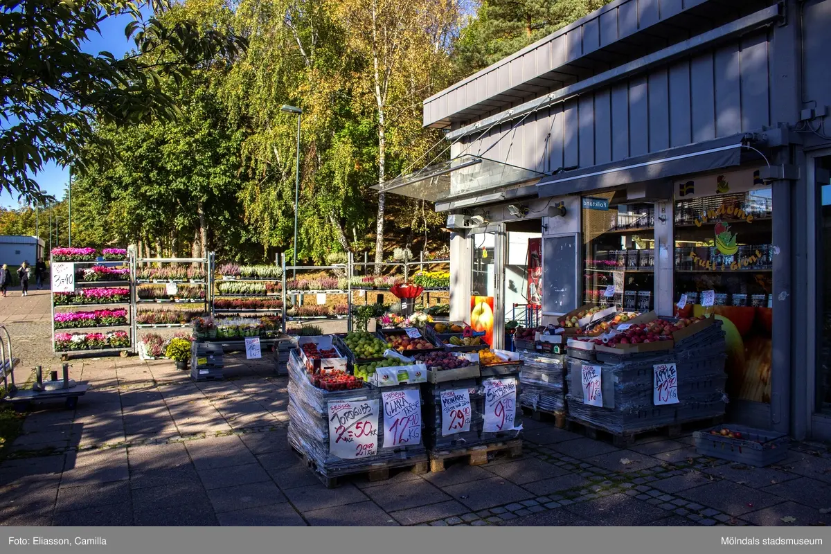 Affären Lindome Frukt & Grönt i huset Almåsgången 2 i Lindome centrum den 4 oktober 2016. Även på utsidan finns varor till försäljning. Fasaden vetter mot söder.