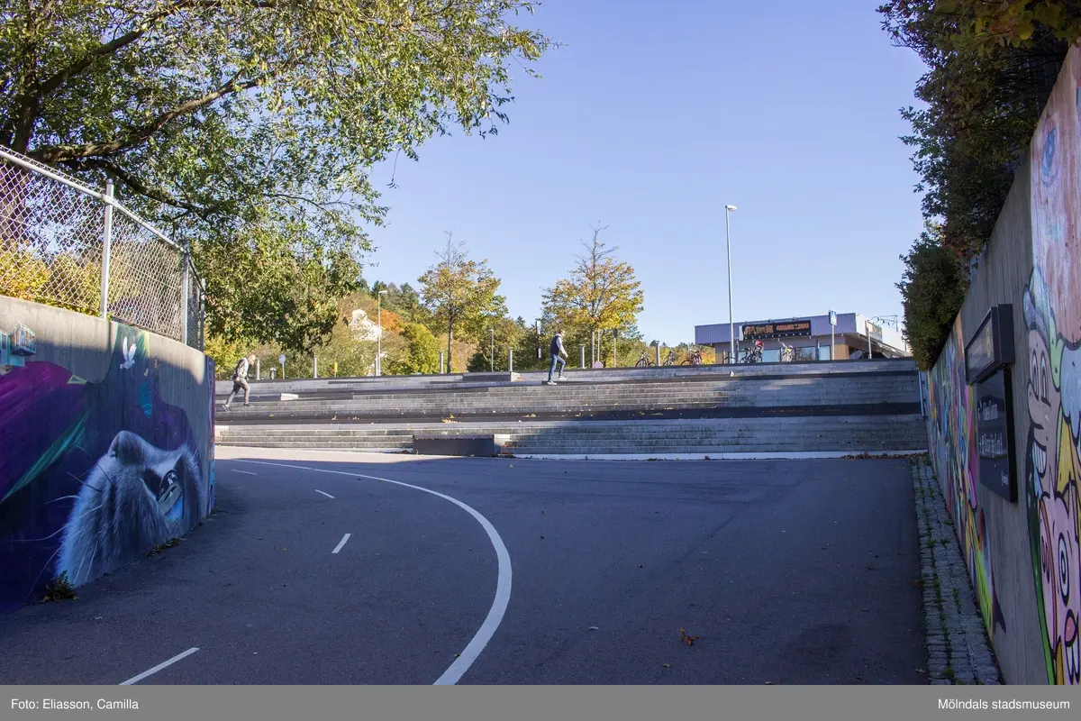 Trapporna från busstationen till Kållereds station. Betongen är dekorerad med färglada målningar. I bakgrunden skymtas Restaurang Guang Zhou i huset Gamla Riksvägen 67. Vy mot öster. Kållereds centrum den 6 oktober 2016.