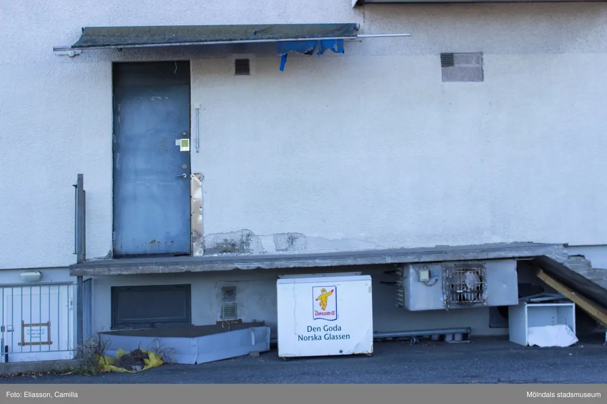 Baksidan, fasad mot väster, till servicebutiken i huset Gamla Riksvägen 48 A i Kållereds centrum den 6 oktober 2016.