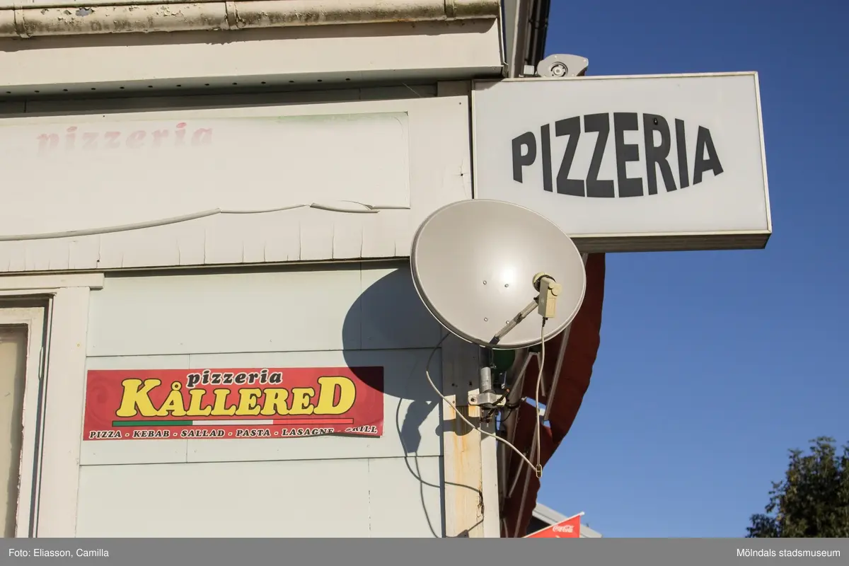 Affärskyltar till Kållered Pizzeria på huset Gamla Riksvägen 38 i Kållereds centrum den 6 oktober 2016. På fasaden sitter även en parabolantenn.