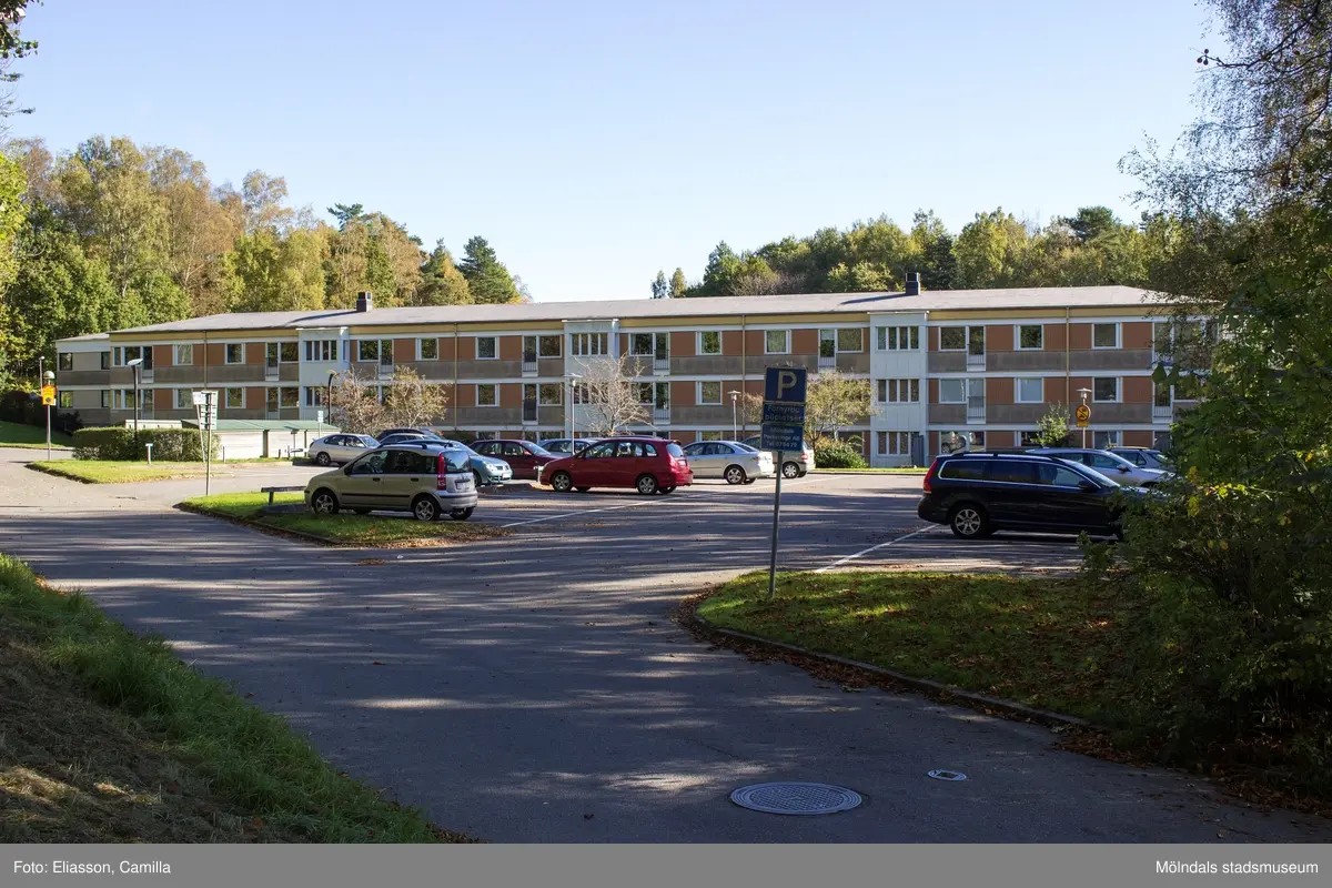 Längst upp på Sagbrovägen i Lindome den 4 oktober 2016. Vy över en parkeringsplats mot ett av husen i bostadsområdet Dotegården. Huset har adresserna Dotegården 23-26. Vy mot öster.