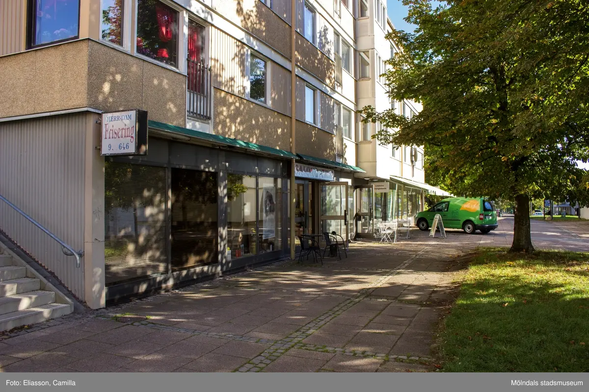 Övre delen av Almåsgången i Lindome centrum den 4 oktober 2016. Vy mot öster. Närmast ses Salong Eilif i gatuplanet till huset Almåsgången 4.