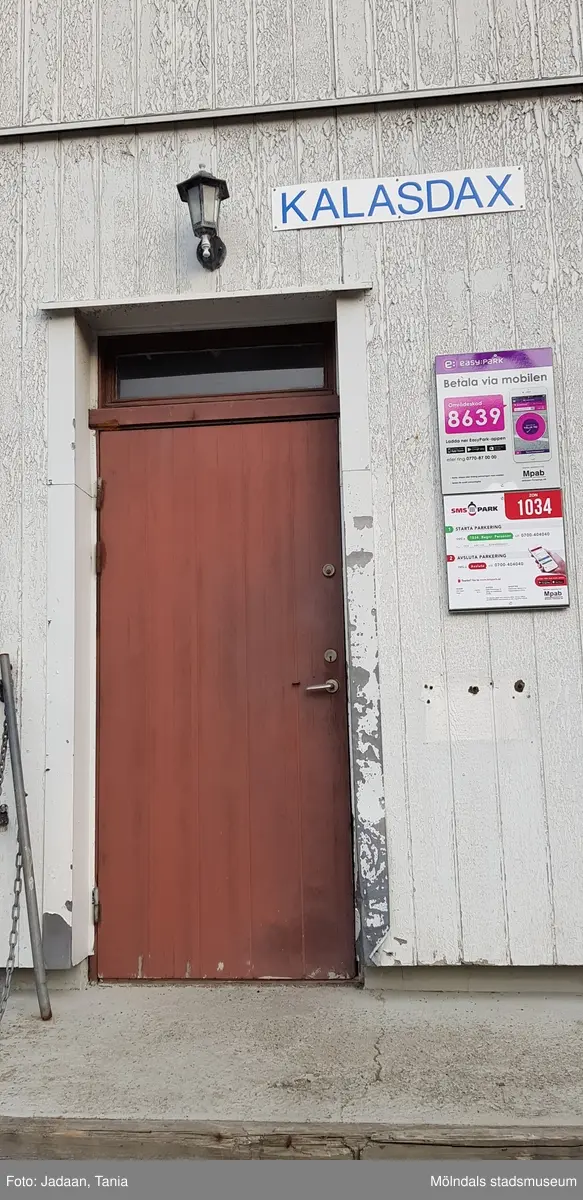 Fastigheten Mörten 2, Åbybergsgatan 30 i Broslätt i Mölndal. Gavel mot Storgatan. Dörr till restauranglokal som tidigare inrymt Dagas Restaurang och Café. Fotografi taget den 17 oktober 2018. Byggnadsdokumentation inför rivning.