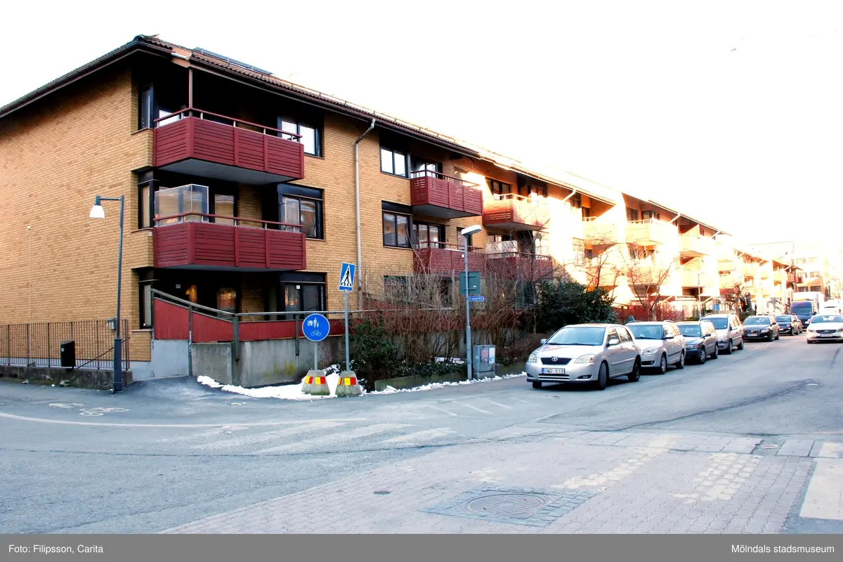 Vy uppifrån mot sydöstra fasaderna till husen med adresserna Bergmansgatan 10 och 8 i Mölndals Centrum. Närmast ses nr 10. Fotografi taget den 26 februari 2018. Byggnadsdokumentation inför rivning.