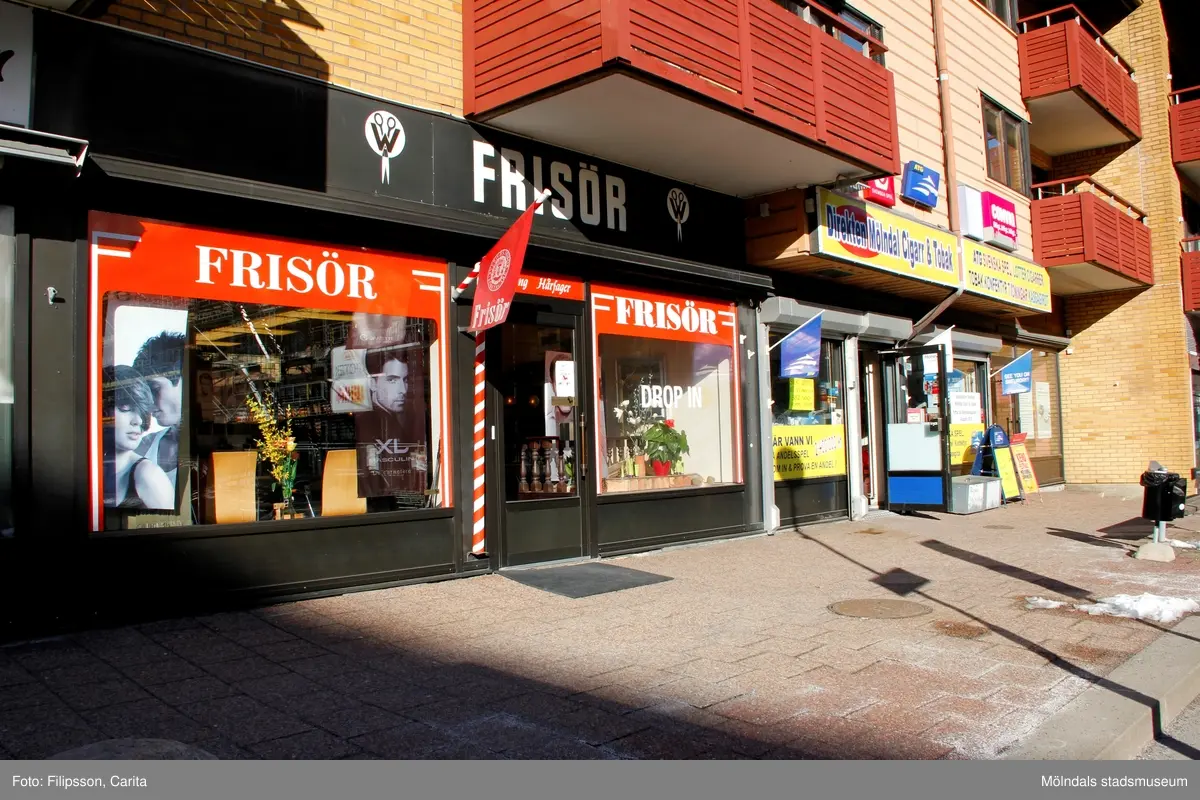 Huset med adress Bergmansgatan 6 i Mölndals Centrum. Entré och skyltfönster till Salong Hårfager samt till tobaksaffären Direkten Mölndal Cigarr & Tobak i gatuplanet. Fotografi taget den 26 februari 2018. Byggnadsdokumentation inför rivning.